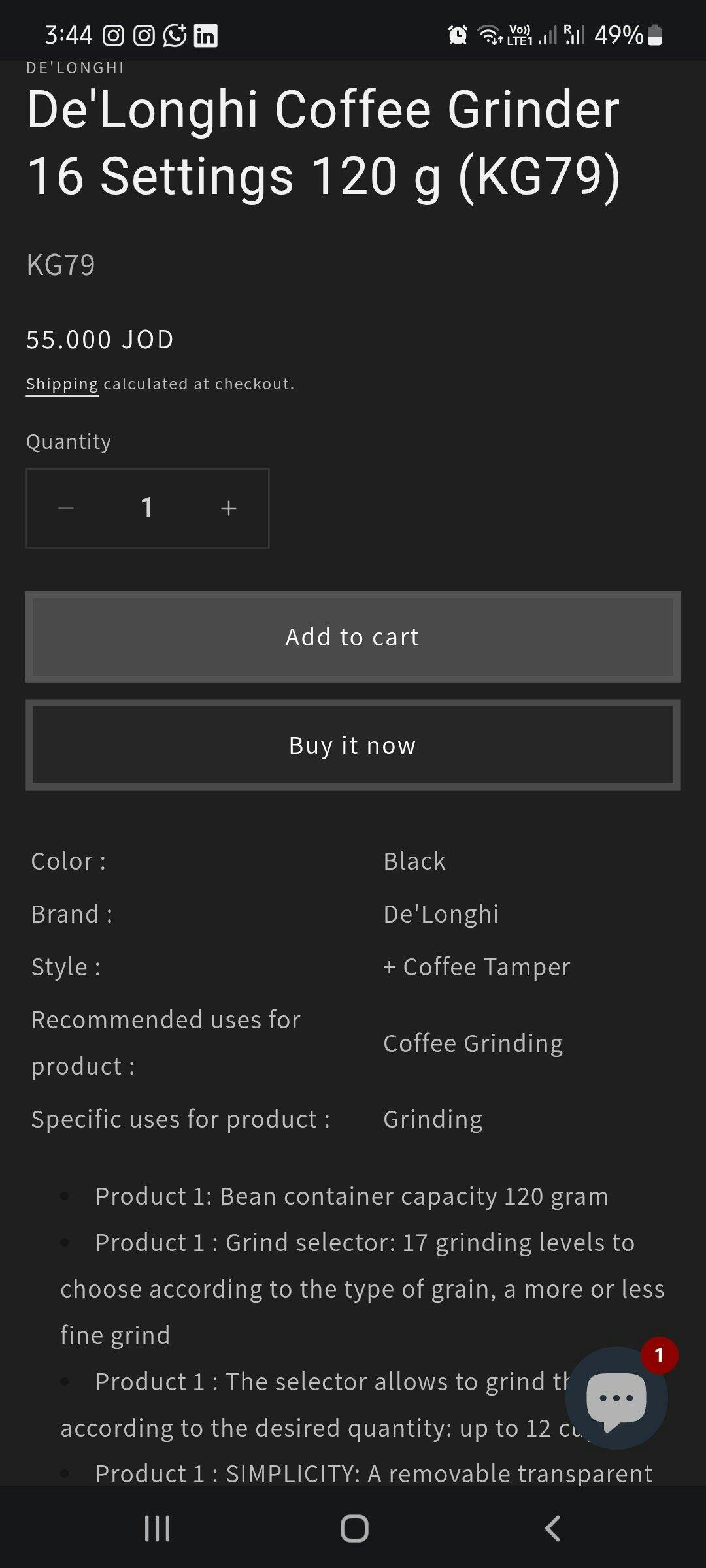 Delonghi Coffee Grinder in sleek black design, featuring a stainless steel flat burr mechanism with 16 adjustable grind settings. Includes a 120g bean hopper and a removable 150g ground coffee container for up to 12 cups. Easy to use and clean with a cleaning brush and removable burrs.