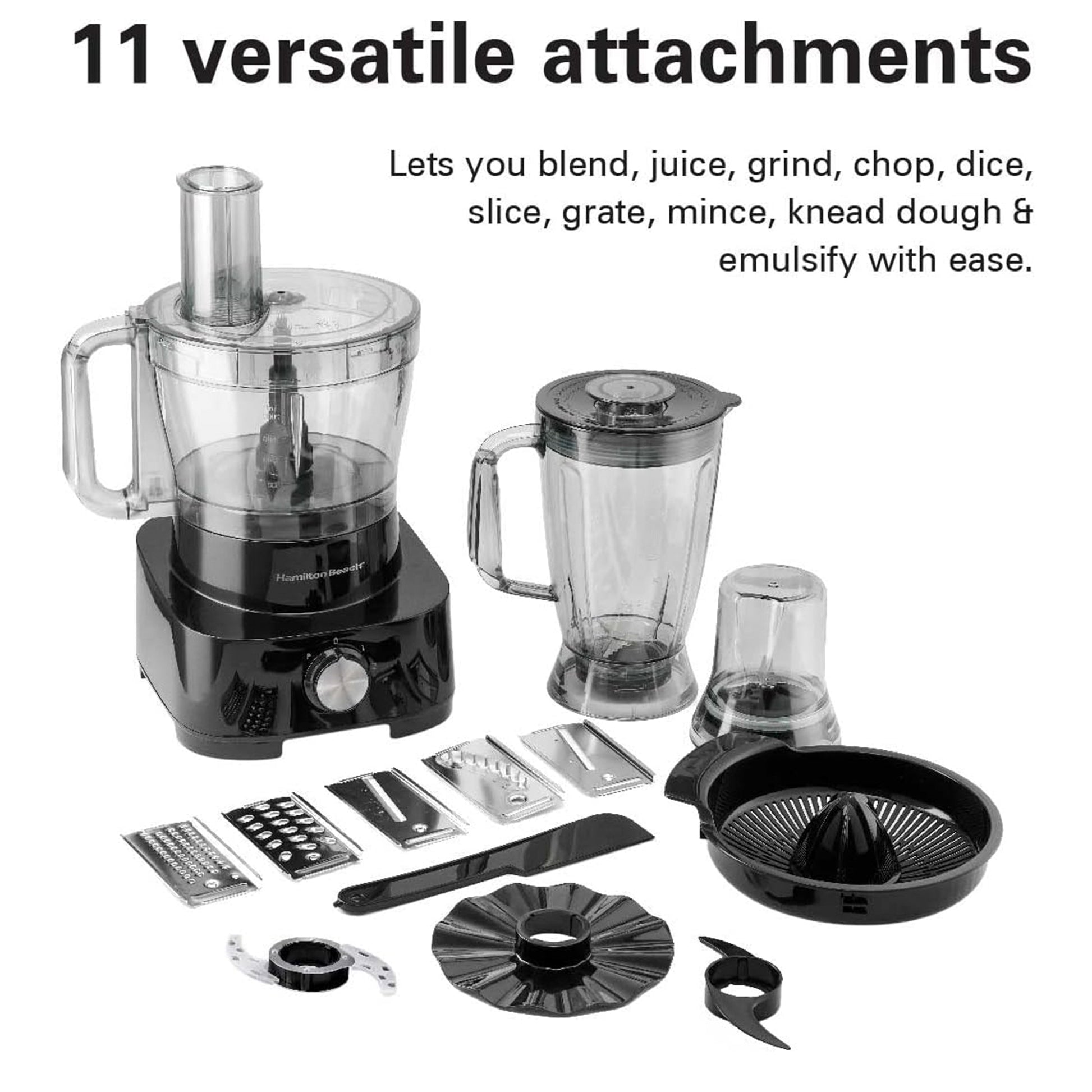 - 11 in 1 Food Processor: Blender, citrus juicer, grinder mill, dice, chopper, knead dough, emulsify, French fry slice, grate & mince.