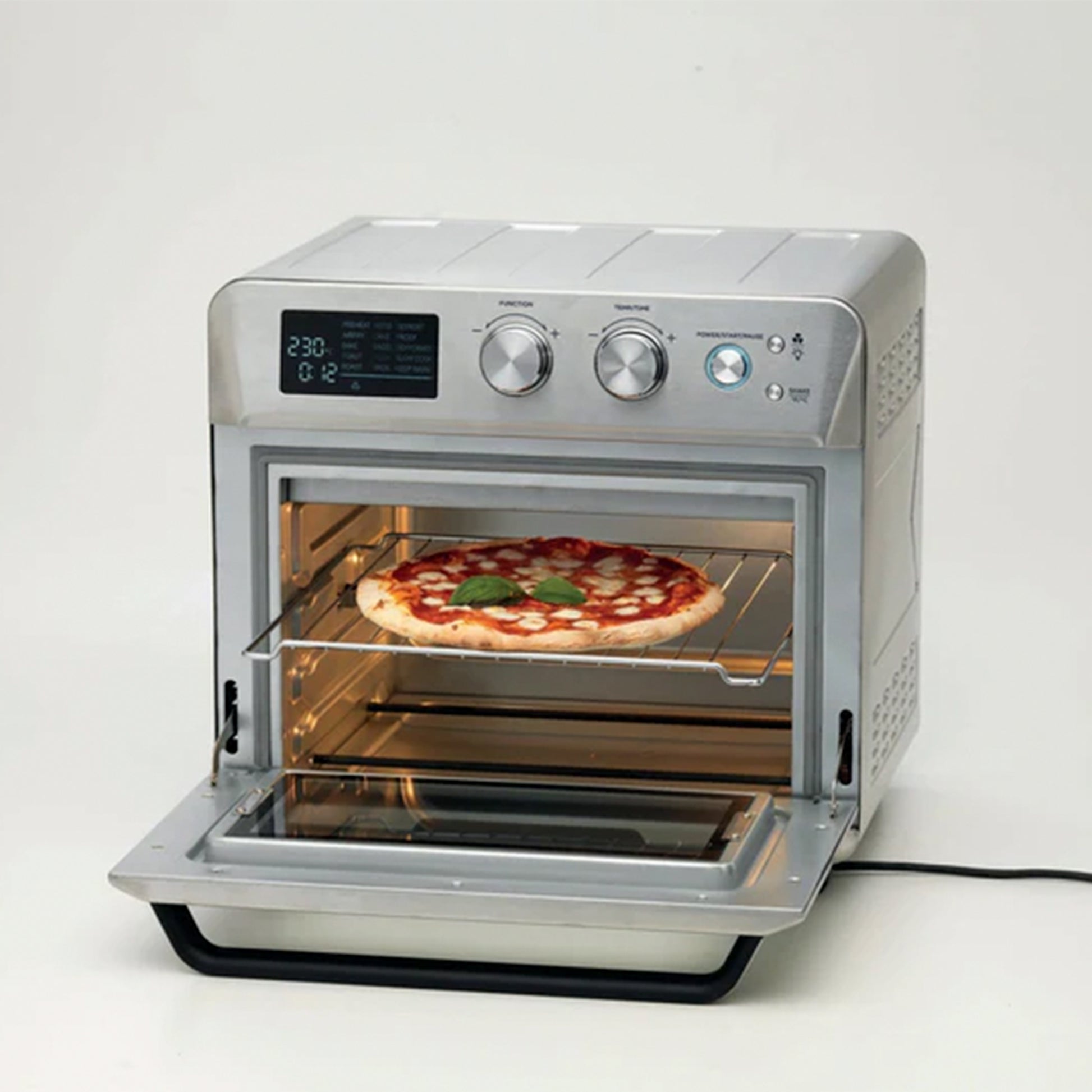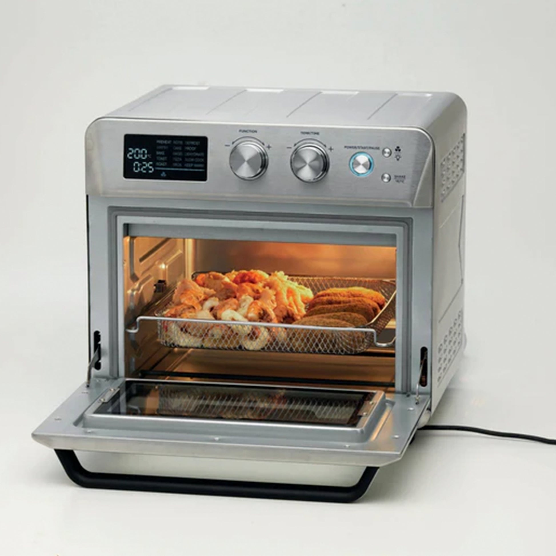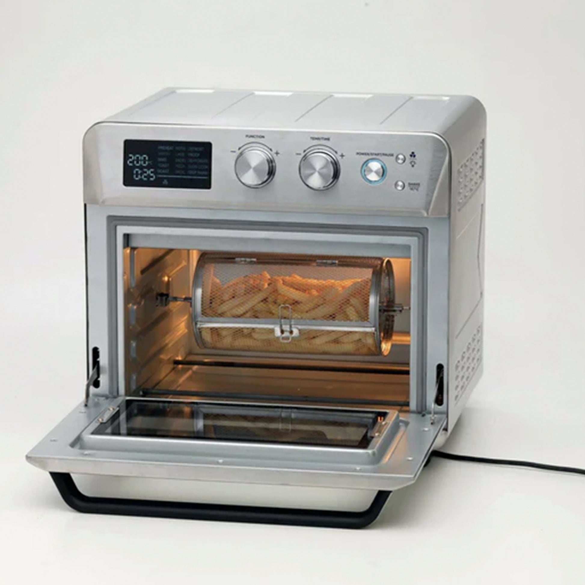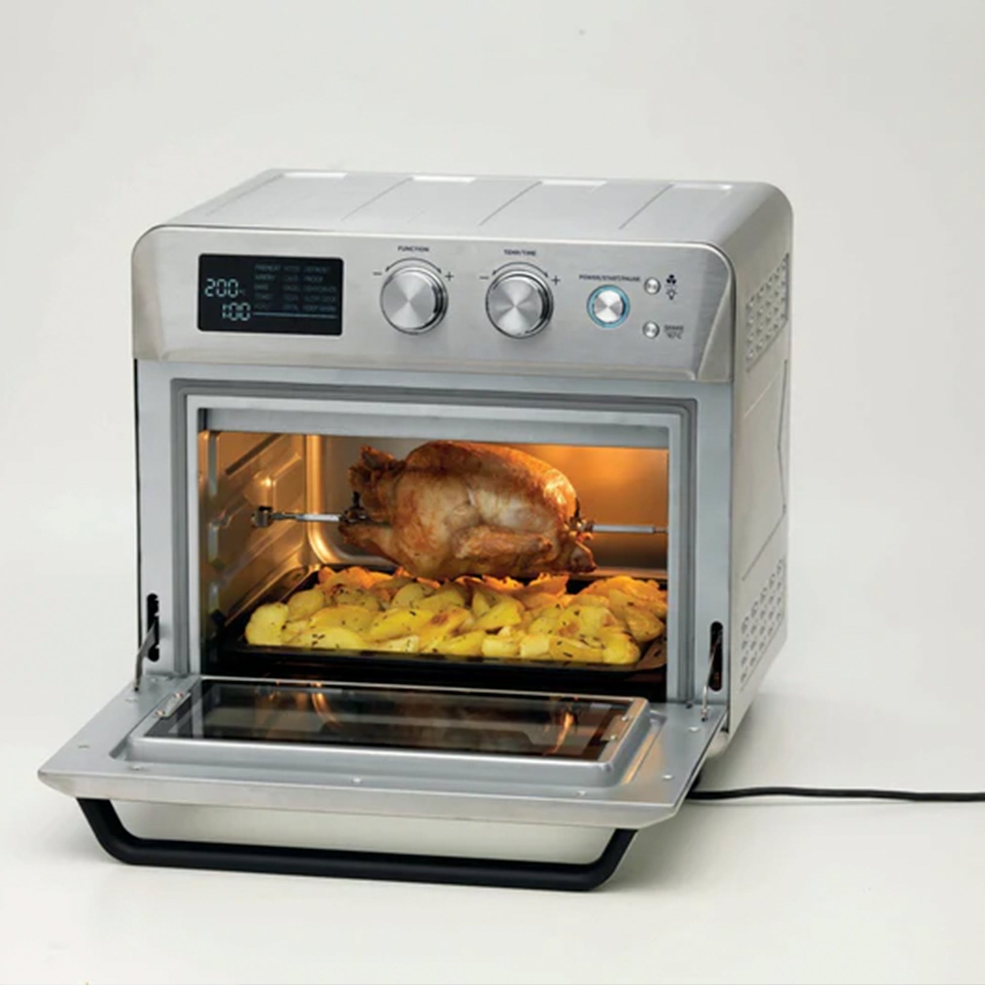 - The 25L Air fryer oven has a built-in rotisserie function for roasting a full chicken and 15 pre-set cooking modes that include frying, roasting, defrosting, heating, grilling, and drying with just one touch.