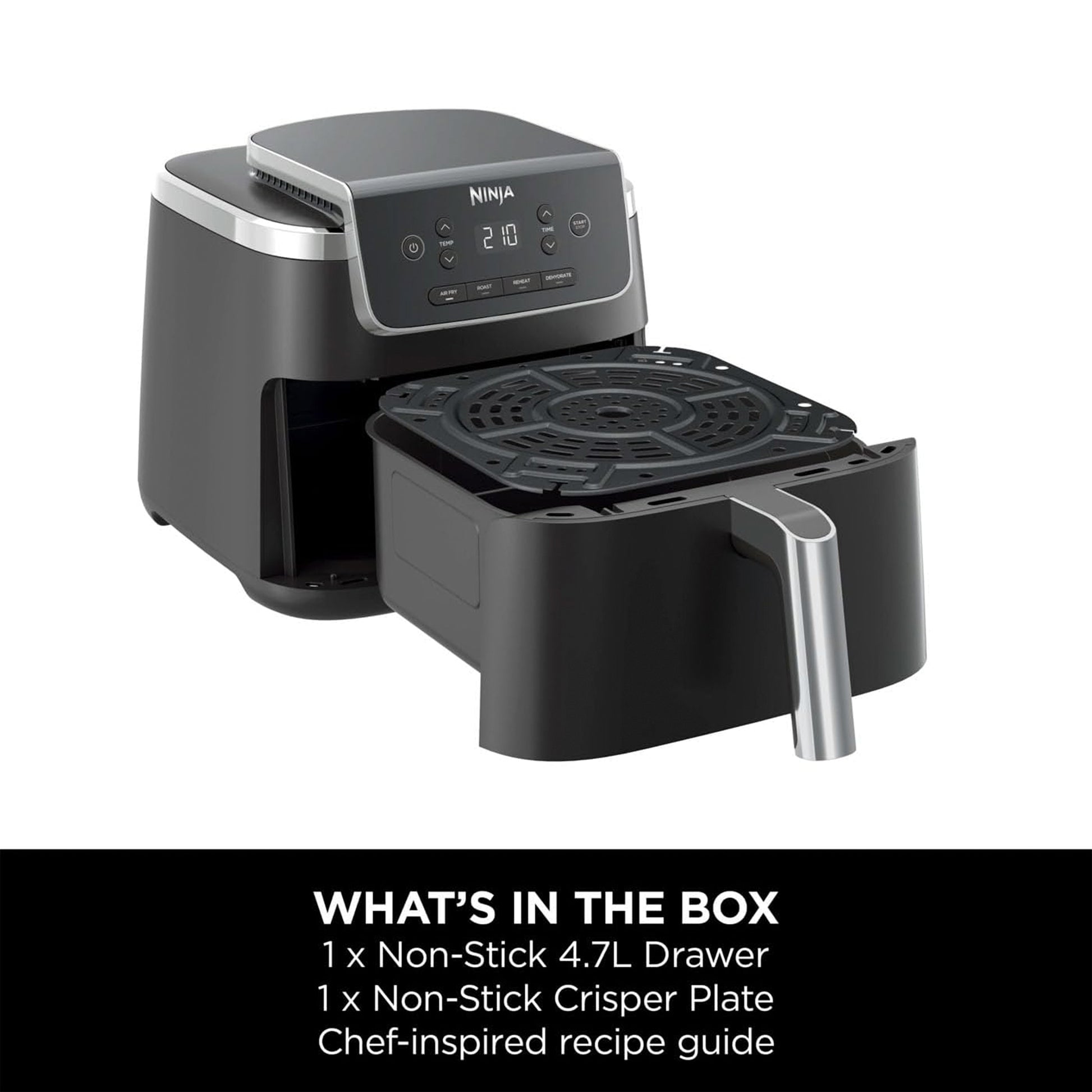 - INCLUDES: Ninja Air Fryer PRO (UK Plug), non-stick 4.7L drawer & Crisper Plate. Chef-Created Recipe Guide. 2000W. Weight: 4.8kg. Colour: Black.