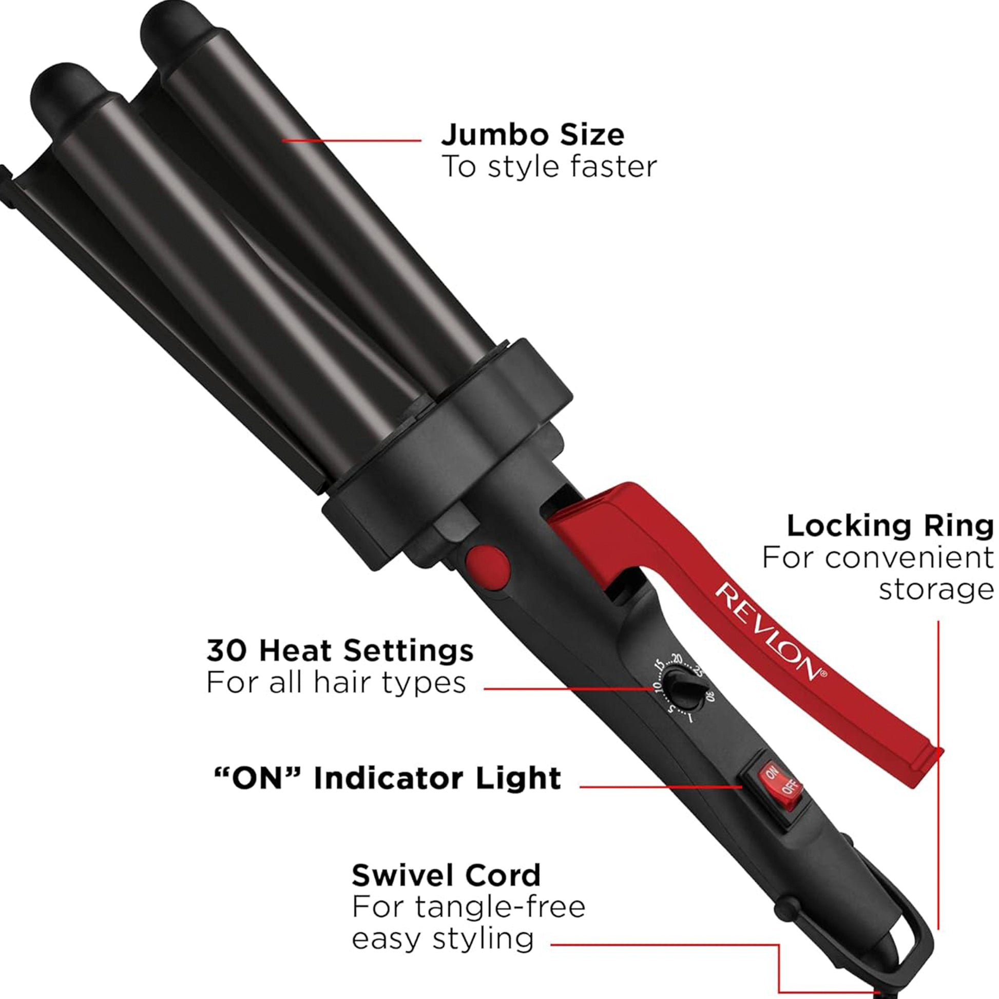 Model name | Revlon Wave Master Jumbo Waver (Three-Prong Jumbo Barrels, Tourmaline Ceramic Coating, 30 Heat Settings Up to 190°C) RVIR3056UKERevlon Wave Master Jumbo Waver (Three-Prong Jumbo Barrels, Tourmaline Ceramic Coating, 30 Heat Settings Up to 190°C) R… See more |