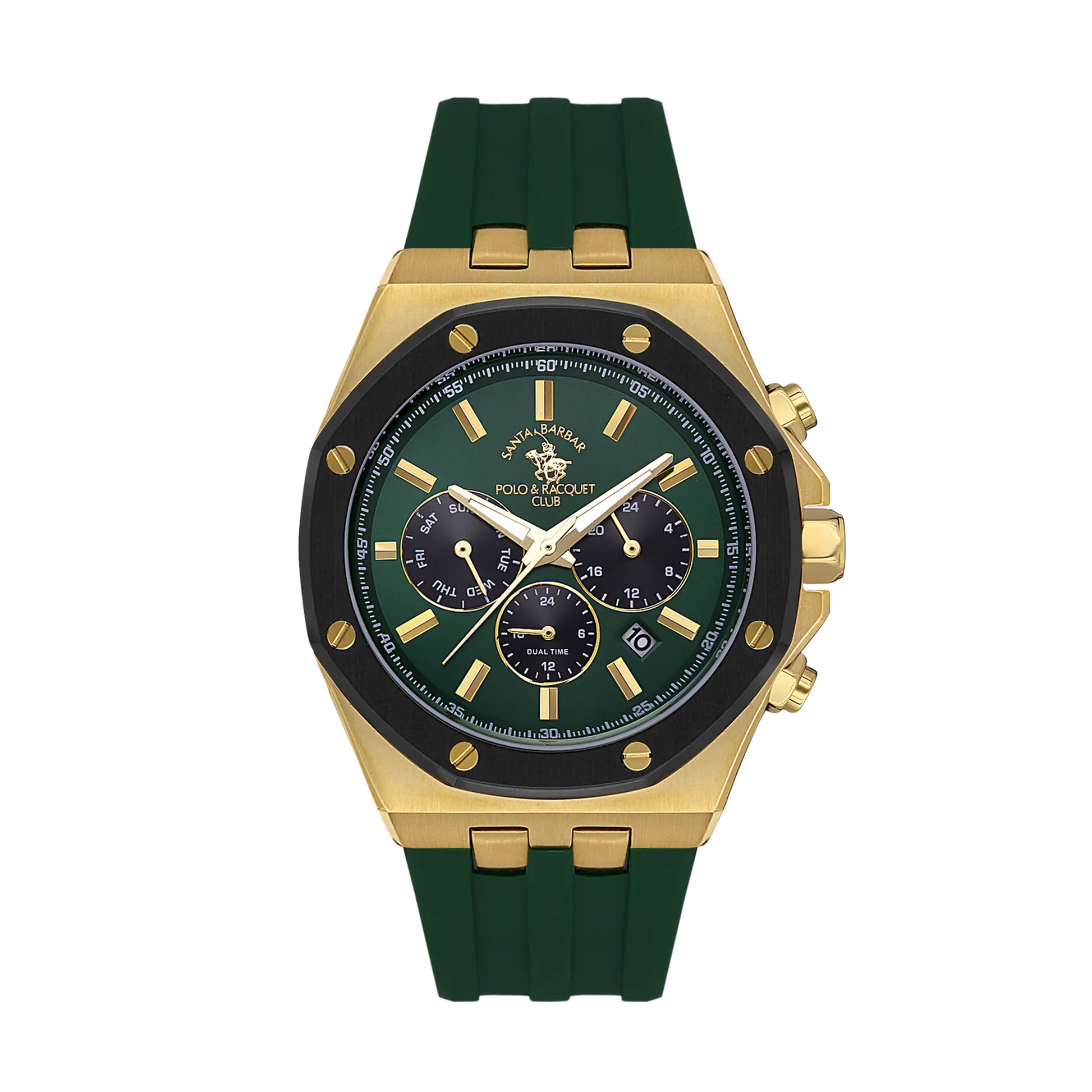 The SANTA BARBARA POLO SB.1.10520-5 men WATCH is a stylish and attractive timepiece. It features a classic design with a gold stainless steel case and a green rubber strap. The watch is powered by a quartz movement.This watch is perfect for any occasion and is sure to make a statement.
