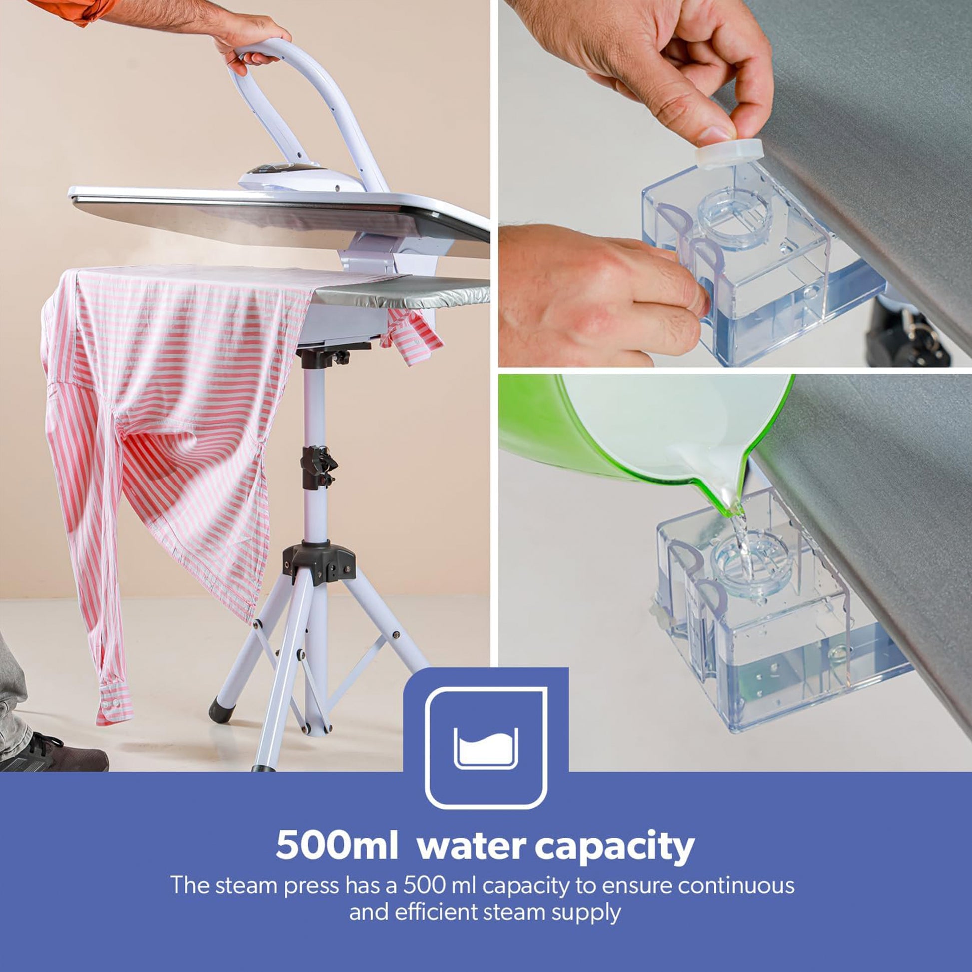 - 00 ML HIGH CAPACITY TANK AND EASY TO USE: The steam press has a 500 ml capacity to ensure continuous and efficient steam supply. This steam press has a 1.8-meter power cord to offer flexibility while ironing