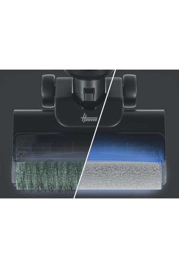 Hoover cordless vacuum delivers powerful cleaning with a 220 W motor and a 21.6 V battery. It features dual 0.55 L tanks for dry debris and wet cleaning, up to 40 minutes of runtime, and a 4.5-hour recharge. Choose between vacuum-only or vacuum-plus-wash modes, plus Turbo Boost, a smart voice assistant, hair-tangle prevention, and an auto-cleaning base that cleans and dries the roller after use. Includes a charging dock and attachments.
