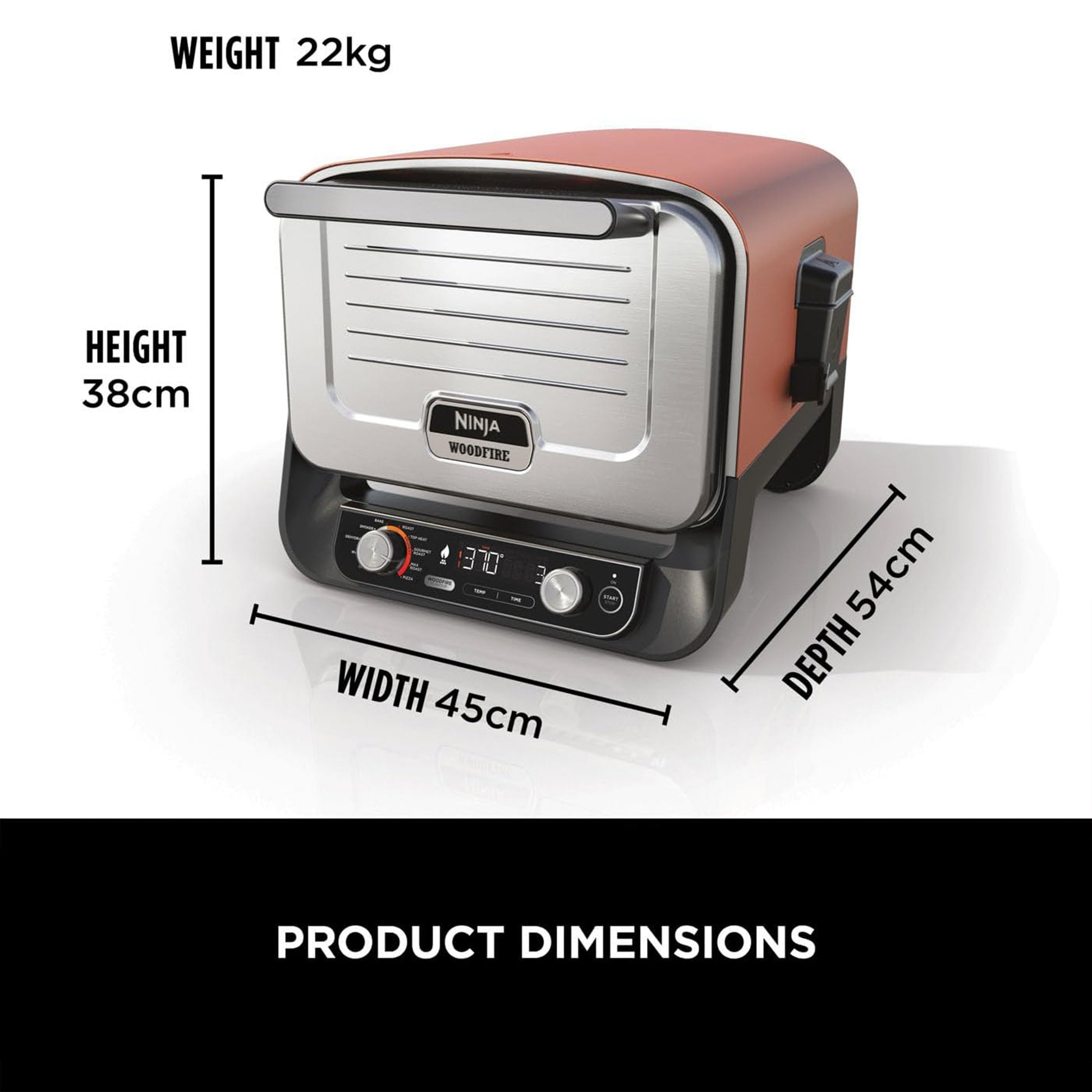 - INCLUDES: Ninja Woodfire Outdoor Oven, Pizza Stone, Accessory Frame, Pro-Heat Tray, Roast Rack, Smoker Box, Pellet Scoop, 2x Pellets Starter Packs. 2400W. Weight: 14.6kg. Colour: Burnt Orange