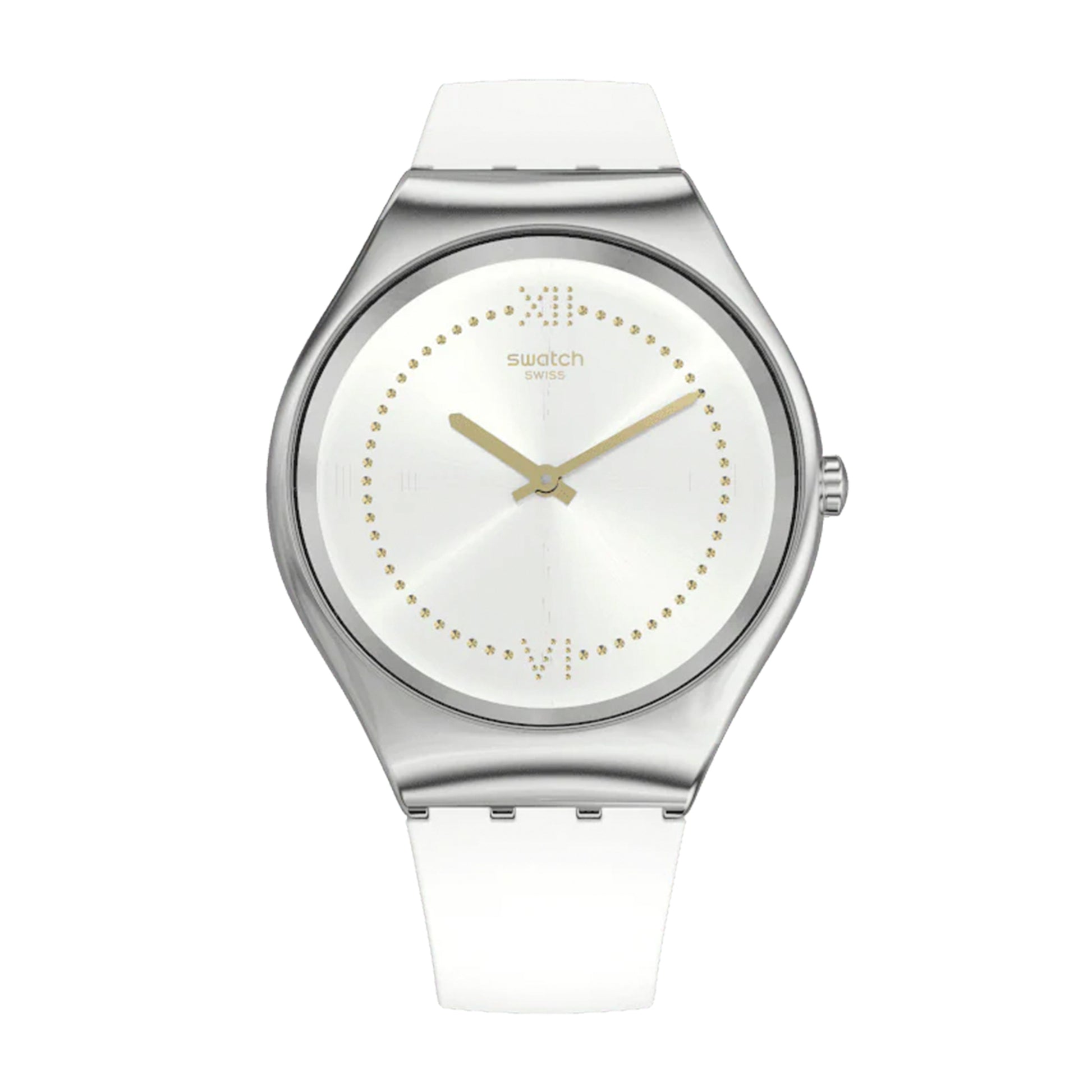 Subtle and discreet, the SKINDOREE is the perfect plus one for any sophisticated occasion. The white silicone bracelet gives space for the polished stainless steel case to shine. Nevertheless, the real stars are the golden Swatch Sparkles on the sun-brushed silver dial. Red carpet, here I come!